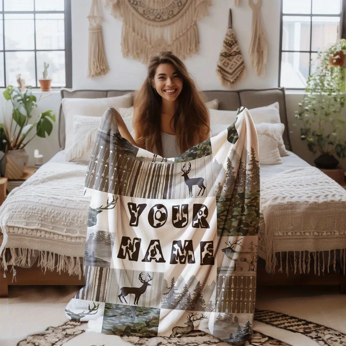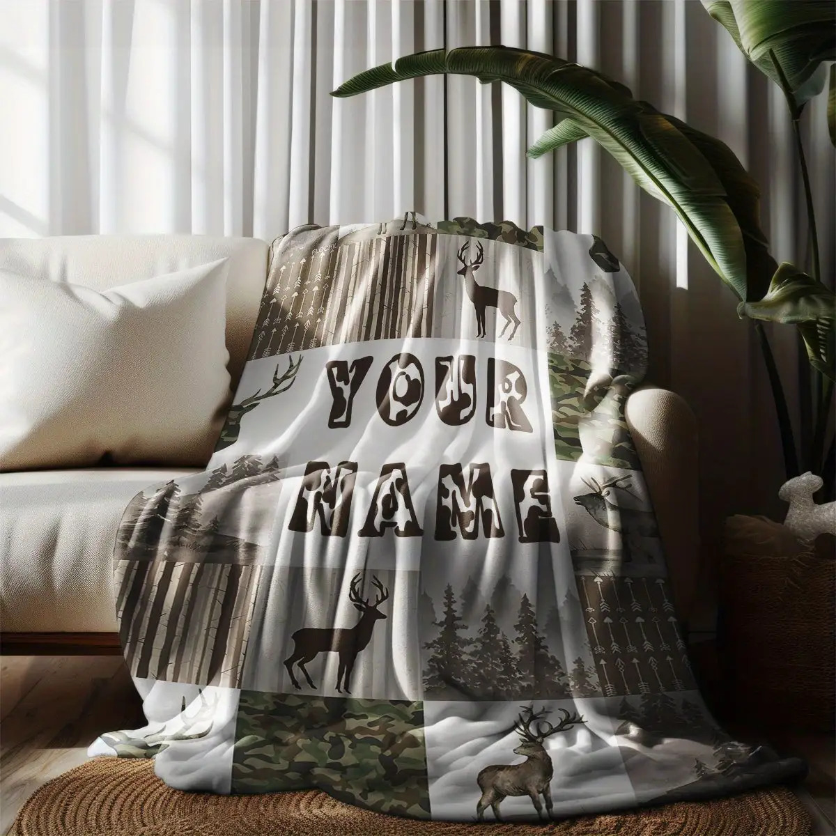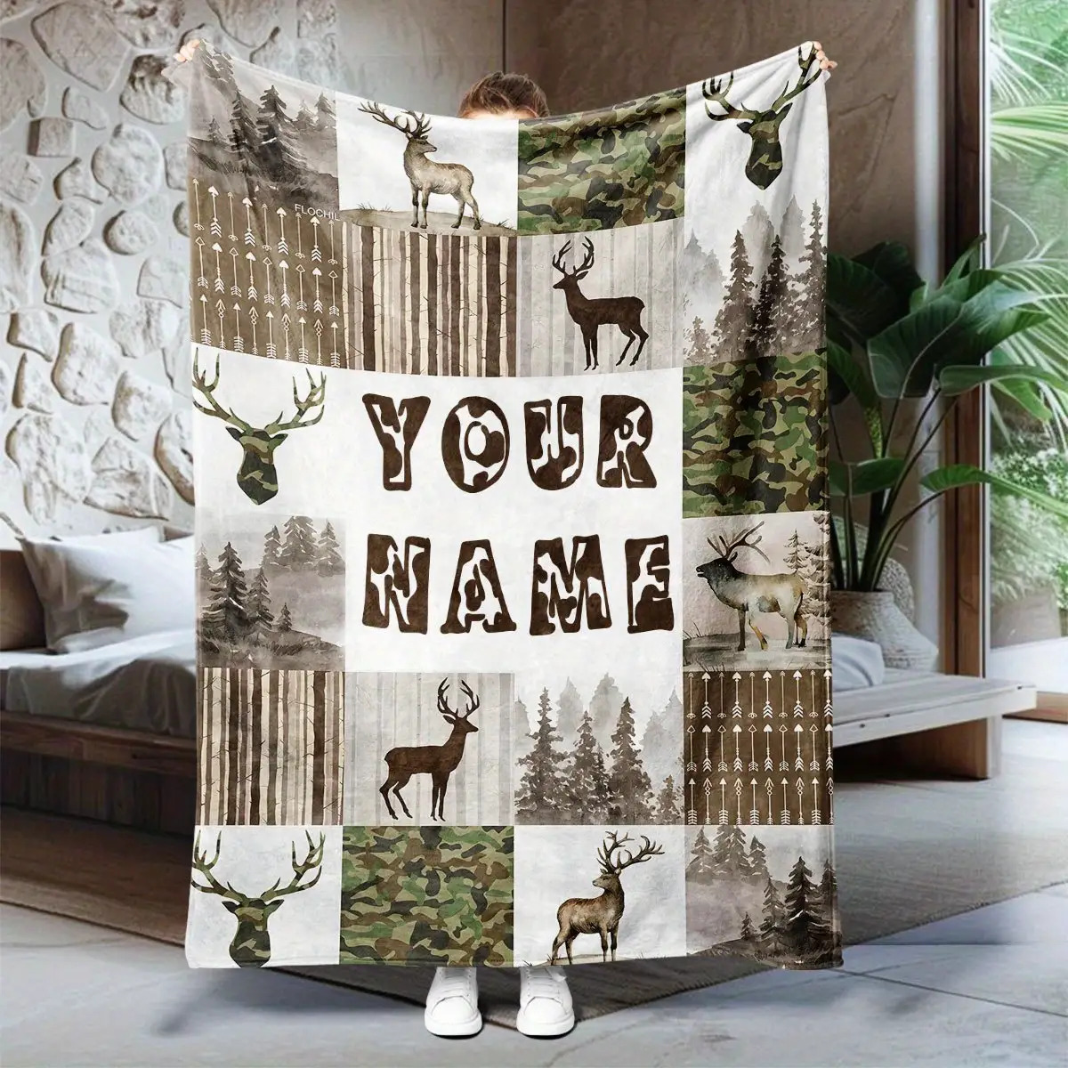 Flannel Blanket - Custom Name Deer Pattern Outdoor Forest Camouflage Blanket