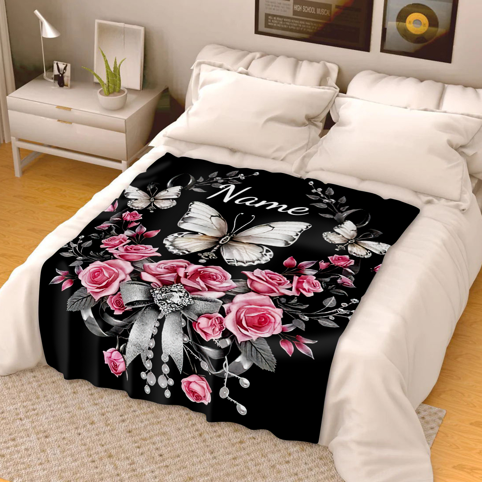 Flannel Blanket - Black with Butterfly and Rose Pattern